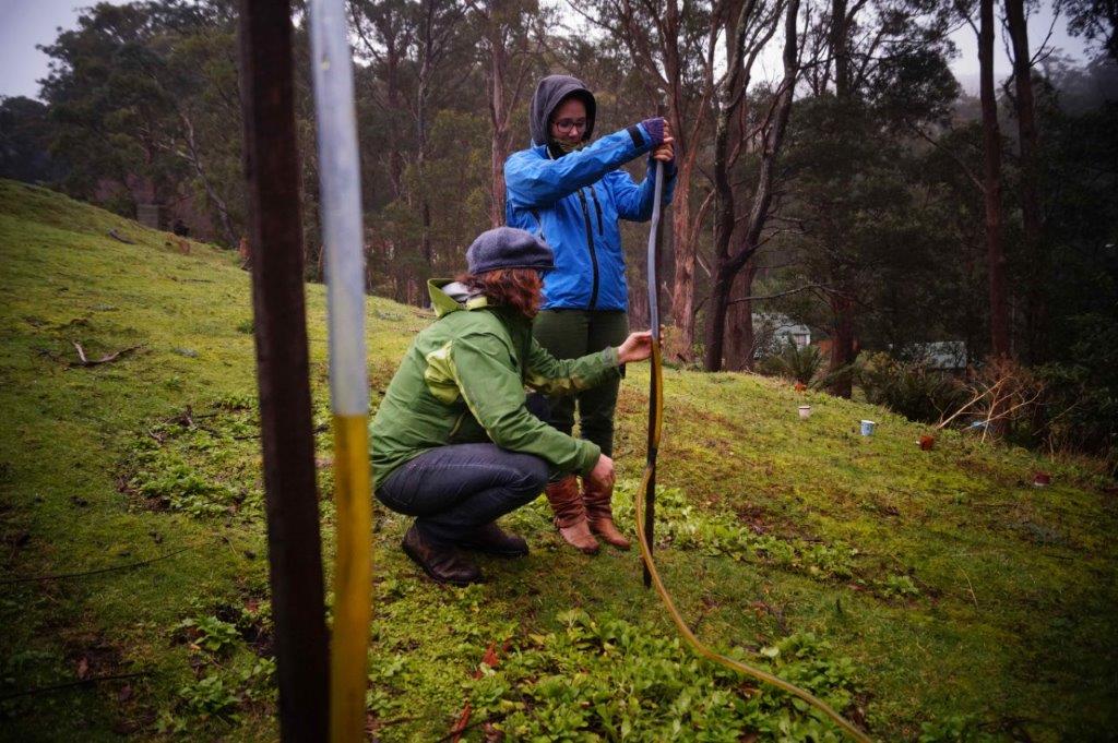We’ve taught both low-tech (A-frame and the bunyip level above) and high-tech (laser level) methods in finding and marking out contour lines. Here you can see Caroline and Nysha learning the ways of the bunyip level, aka the water level. Where ever possible we make sure we teach a range of options for what tools and methods you can use so that even if you’re working with a tiny budget you can get the job done.
