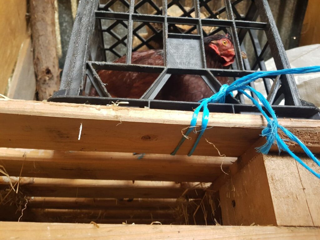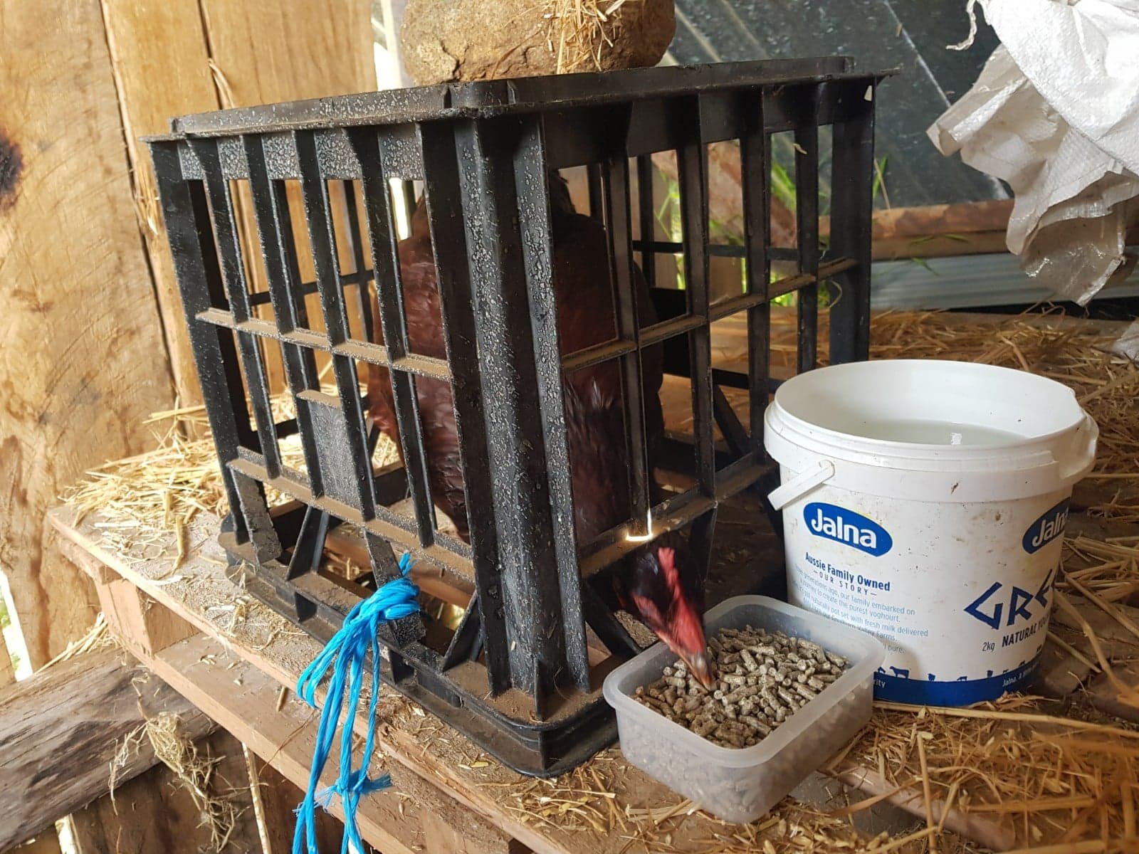 We use a recycled milk crate to contain her on a timber pallet shelf (weighted down with rocks and tied with some twine so she can’t push it over) with lots of airflow and no straw to nest on. You don’t want to give them a cosy bed to keep nesting on as they’ll just happily keep being clucky.