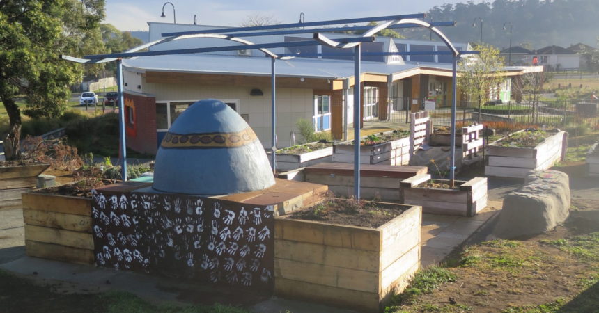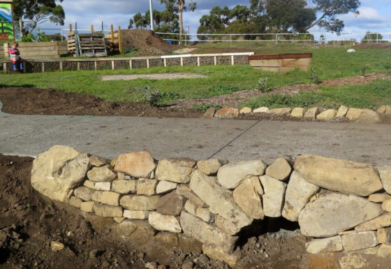 Special features include a pizza oven with a pergola which grape vines will grow up and over, lockable timber tool chests that double as seats, a windbreak using native plants some of which are local bush tucker plants, a bridge built from rocks and raised wicking beds including some designed specifically for people using wheelchairs. It also has a giant chest board that doubles as a stage for performances!