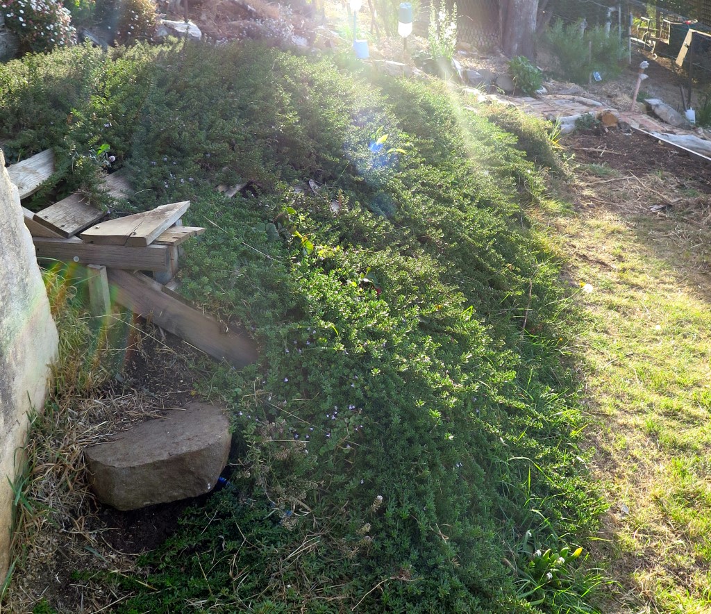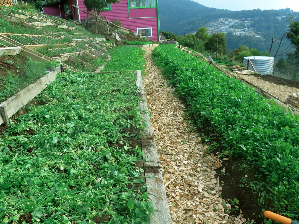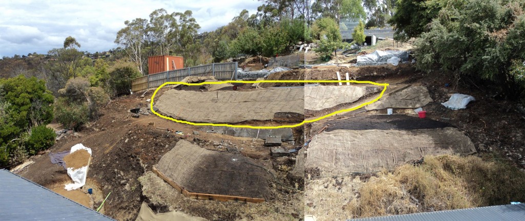 Directly after the earth works, we quickly covered the steep earth berms with jute mesh to help stablise the soil and hold the clover seeds we broadcast (in hindsight, jute mat would have been better). We then put in some basic timber shelves, back filled them with good soil and planted them out densely.