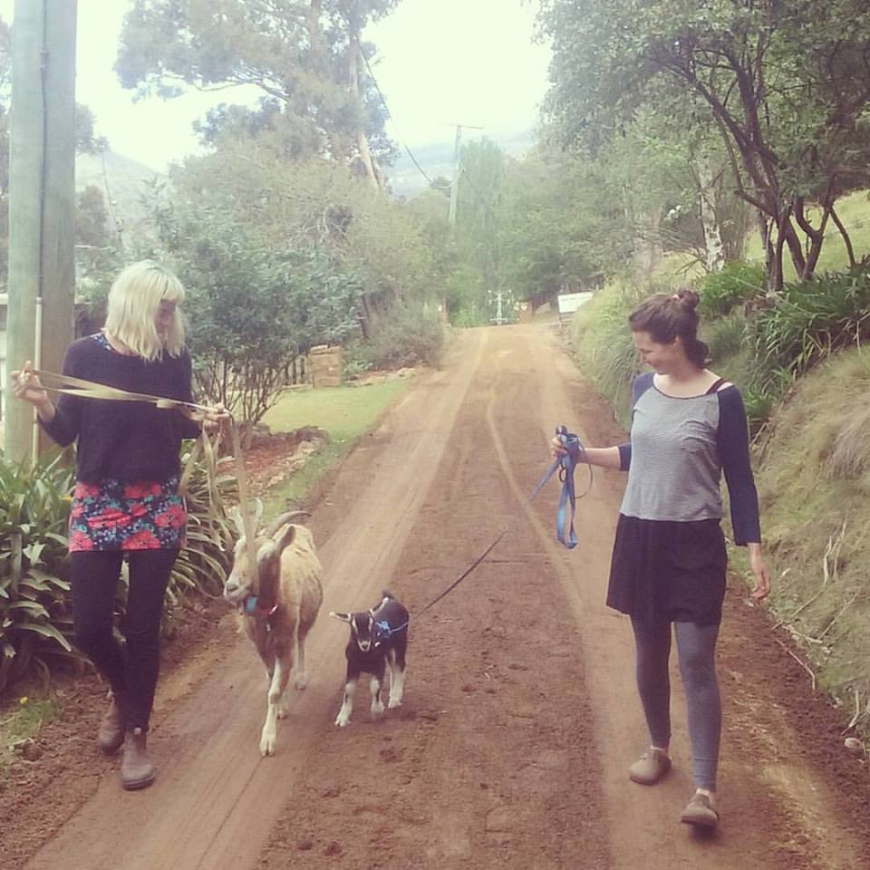 Our main incentive to have goats is to be able to access ethical dairy. While we have just over 3/4 of an acre, we’re less than 3kms from Hobart city, so it’s very urban all around us. Our property is incredibly steep which meant we terraced it to form some functional spaces. Our two goats live on one of these terraces. They don’t free-range across the whole property as we have extensive vegetable gardens and large orchards they would destroy, instead we tether them around the garden at key points where they can eat grass and shrubs. We also take them for little walks down the local bush track to get some exercise.