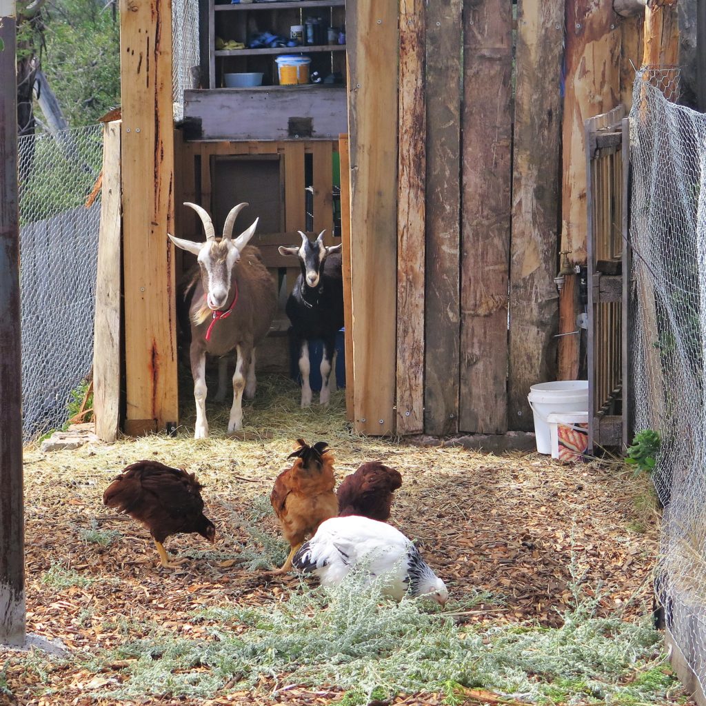 The front gate leading into the goat yard. The chickens also share this space – that’s their blue house on the left.