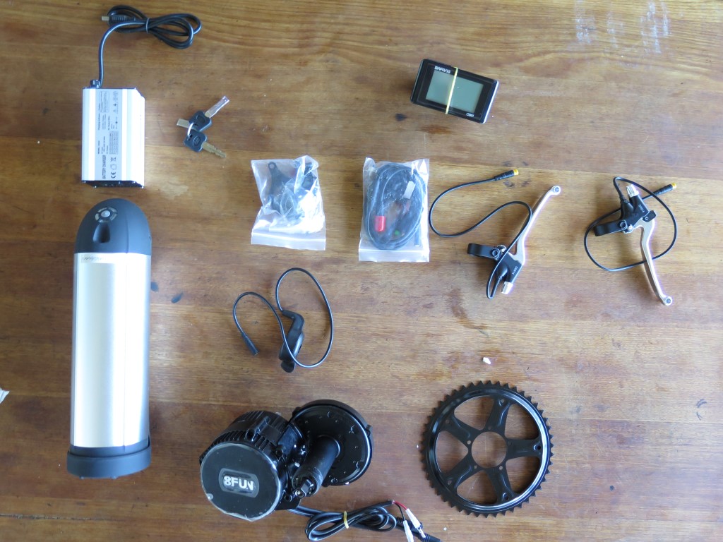 The kit arrived in two box’s. One containing the motor and controller, the other the battery and charger . This photo shows all the components laid out on a table. Neat, clear and only one way to attach all the cables.
