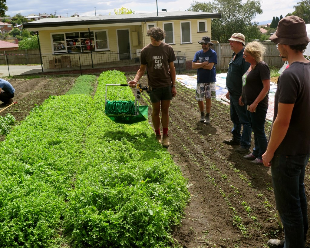 We held this workshop across the road from the Hobart City Farm, which meant we could pop over, play with their very awesome tool collection and have a sticky beak at a young, small market garden which is largely base on Jean-Martin’s book, The Market Gardener.