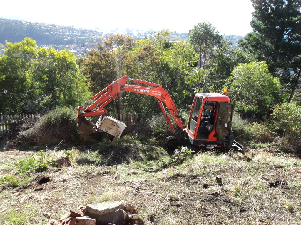 We don’t really have a good photo of what this space looked like before we started work on it. But here’s a photo of the excavator moving rubbish (the previous owner dumped there) when we were in the early stages of getting things started.