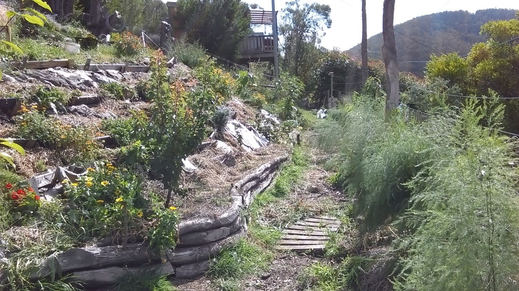 Globe artichokes and comfrey have been planted on the downhill side of the slope to capture excess water runoff (they love moist, fertile spaces) and to stablise the slope.The comfrey also gets slashed back a couple of times every summer and used as mulch for the fruit trees.