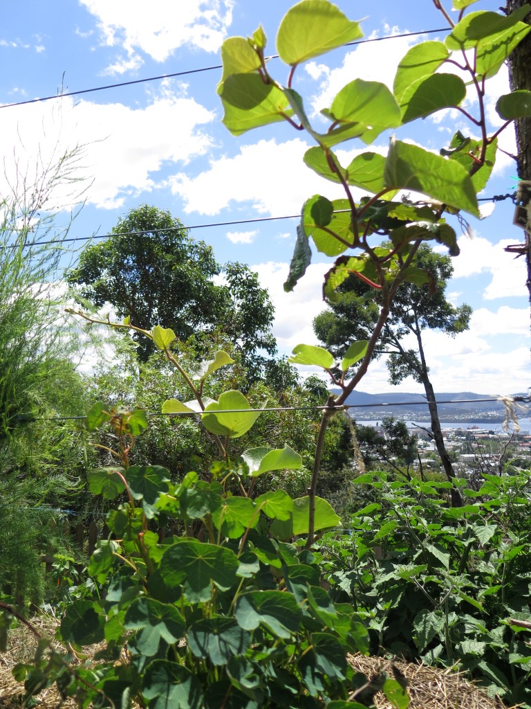 Kiwi vine with perennial nasturtium and a rogue cape gooseberry in the background