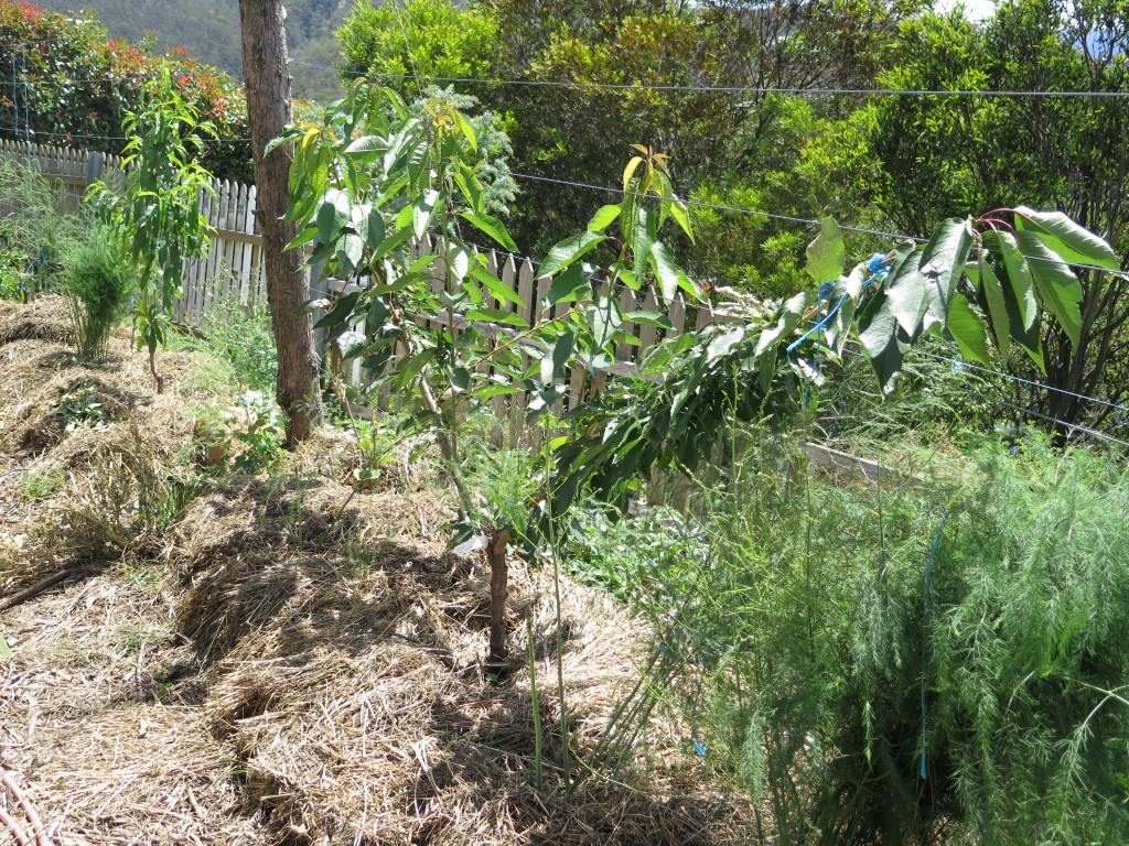 In the photo below, you can see a fluffy plant on the bottom right, along the line of espaliered fruit trees – this is asparagus, which has gotta go. It’s simply too big and dominating for our super compact orchard and will compete with our fruit trees for nutrients and space above and below the ground. I had a moment of false enthusiasm when I planted it so will be transplanting it into another space this coming Winter. In a larger orchard, asparagus can be planted easily, we’re just a bit space poor on our crazy steep slope.