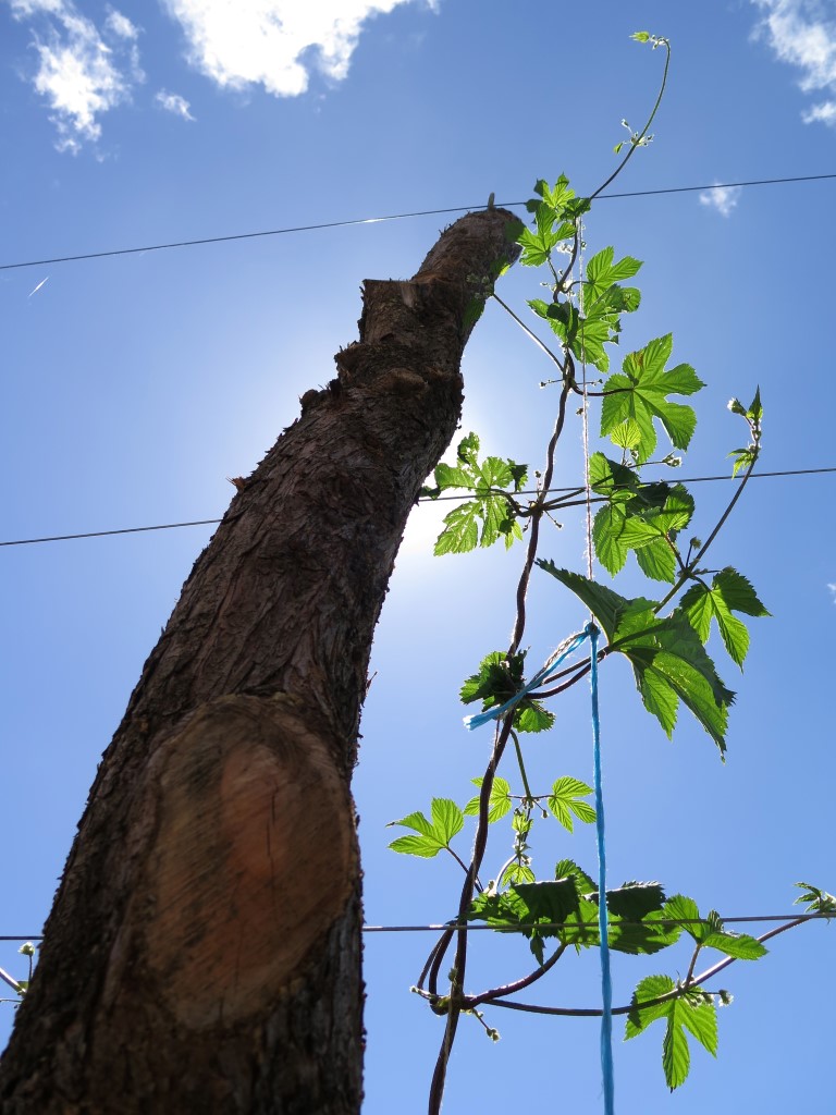 We also planted hops which are a perennial crop that grow super tall into Summer and get cut down every Autumn. The idea is that they can be trained along the same framework as the fruit trees and kiwis, just at a different height, so they can all live harmoniously in a compact space.