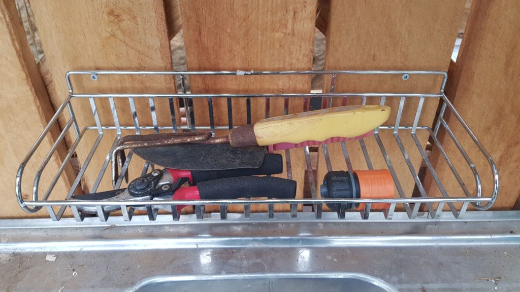 The little tray thingo: I’m in love with this $3 tray from the tip shop. This is where all the random little irrigation/hose bits will live, plus some tools I frequently need for propagating. No more losing them throughout the garden.
