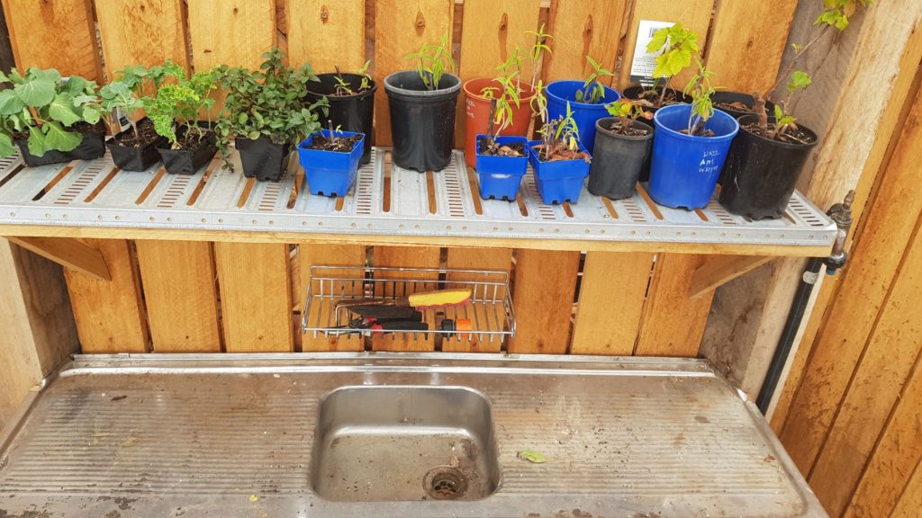 The cupboard: This is where we store pre-mixed potting mix, pots/trays, watering can and a bucket to catch the water from the sink. Eventually we’ll plum it into a garden drain – but for now, it’s more than fine.