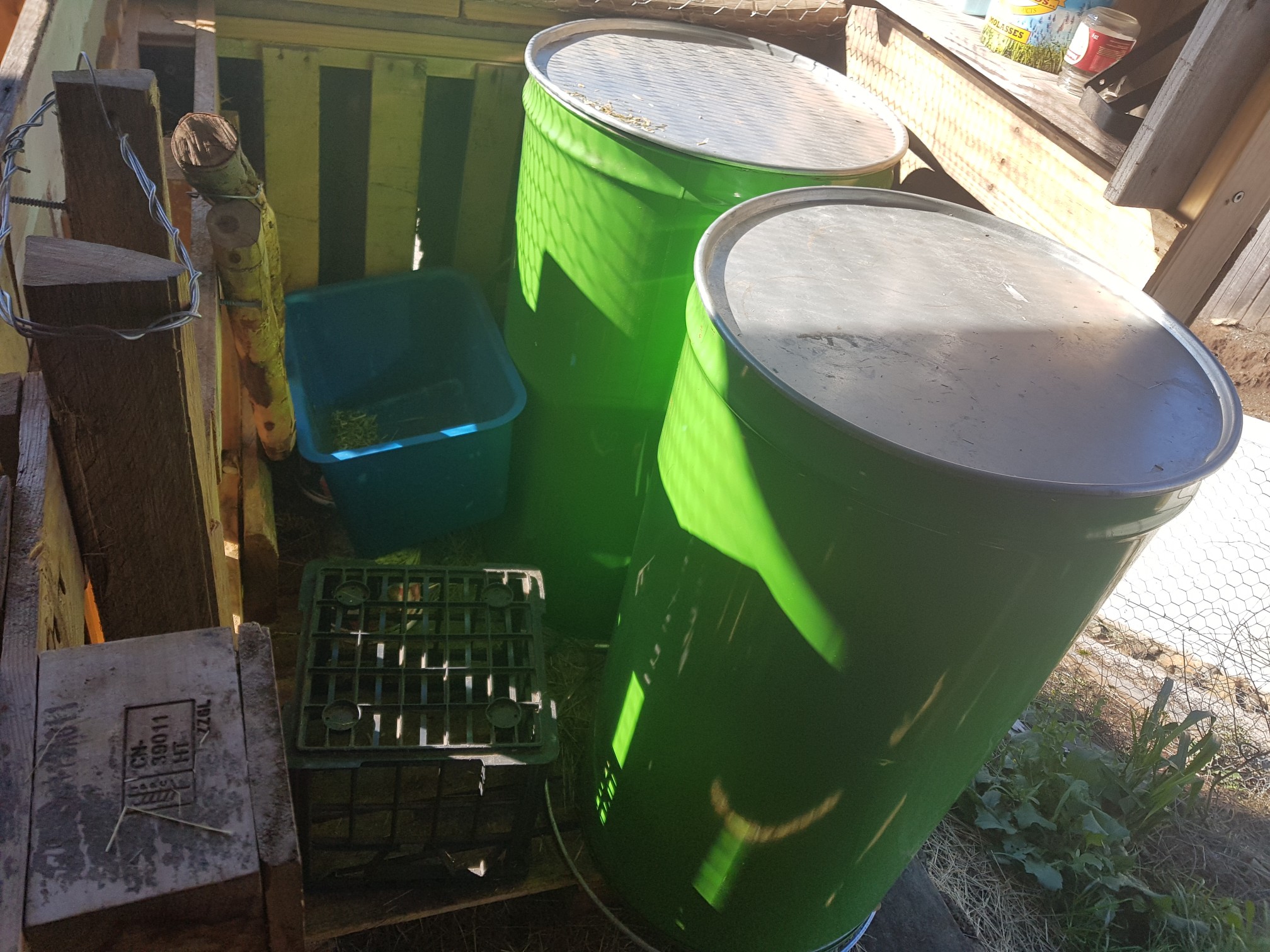 Two 44 gallon drums for storing feed – keeps the rodents out of it.