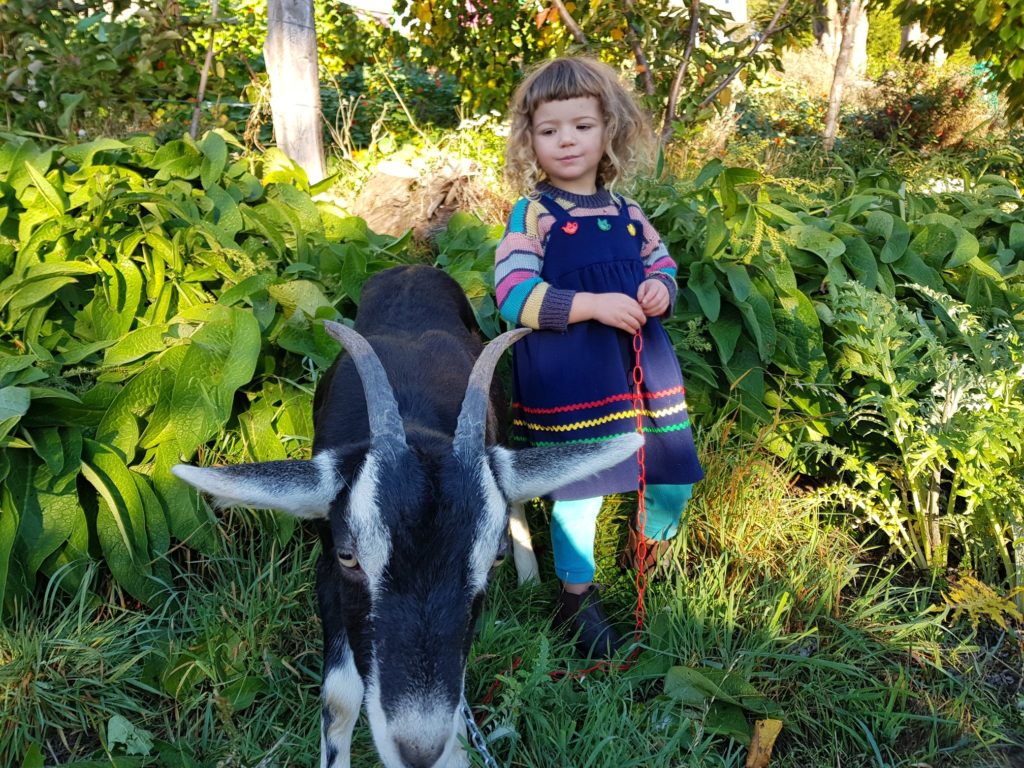 Frida with Jilly who’s being tethered near a comfrey patch for her munching pleasure.